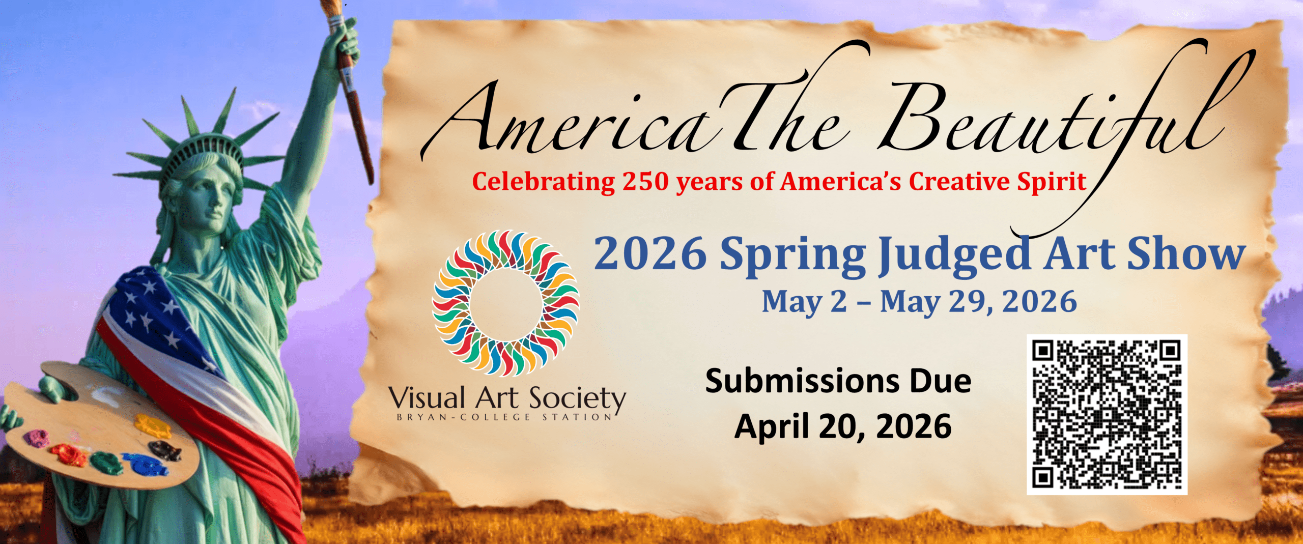 We are pleased to announce our annual 2026 Spring Judged Show, "America The Beautiful," as we celebrate 250 years of America's creative spirit. The show is open to all artists. Our call for art can be found HERE. The deadline for submissions is April 20th.